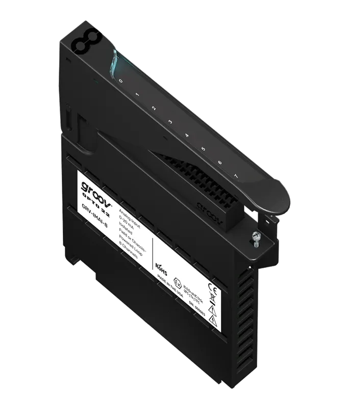 Part of the groov EPIC® system, the GRV-IMAI-8 analog input module is part of the groov EPIC® system. This module provides channel-to-channel isolation on its 8 channels of analog current input with an input range of 0 to 20 mA and 4 to 20 mA. Each channel can be powered by an internally isolated loop supply or from an externally connected loop supply. Ranges are software configurable. The module cover includes an LED that indicates status and a touch-sensitive pad. Touch the pad and the groov EPIC processor displays information about the module, including specifications and a wiring diagram.