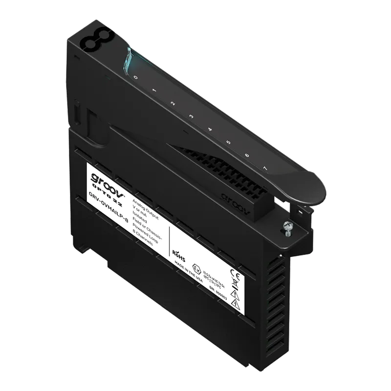 Part of the groov EPIC® system, the GRV-OVMAILP-8 analog output module has 8 channels, individually configurable for any one of five voltage or current output ranges: 0 to 5 VDC / 0 to 10 VDC / 0 to 22 mA / 4 to 20 mA / 0 to 20 mA