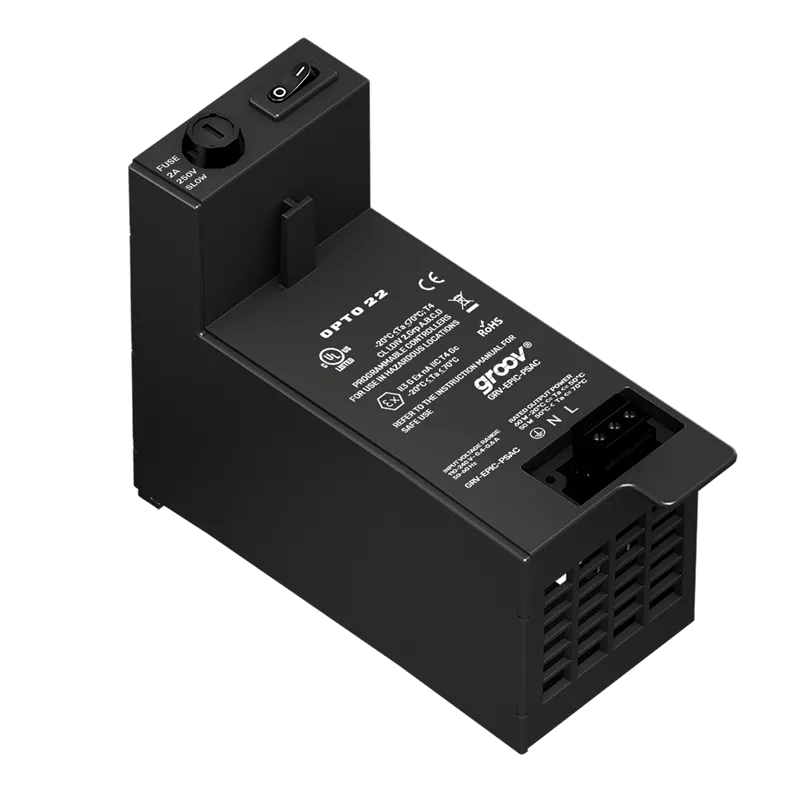 The GRV-EPIC-PSAC power supply provides power for your Opto 22 groov EPIC® system from an AC power source. Packaged in a modern and sturdy housing, the GRV-EPIC-PSAC power supply includes a built-in fuse and an ON/OFF power switch for ease of use. This power supply accommodates input voltage of 100-264 VAC.