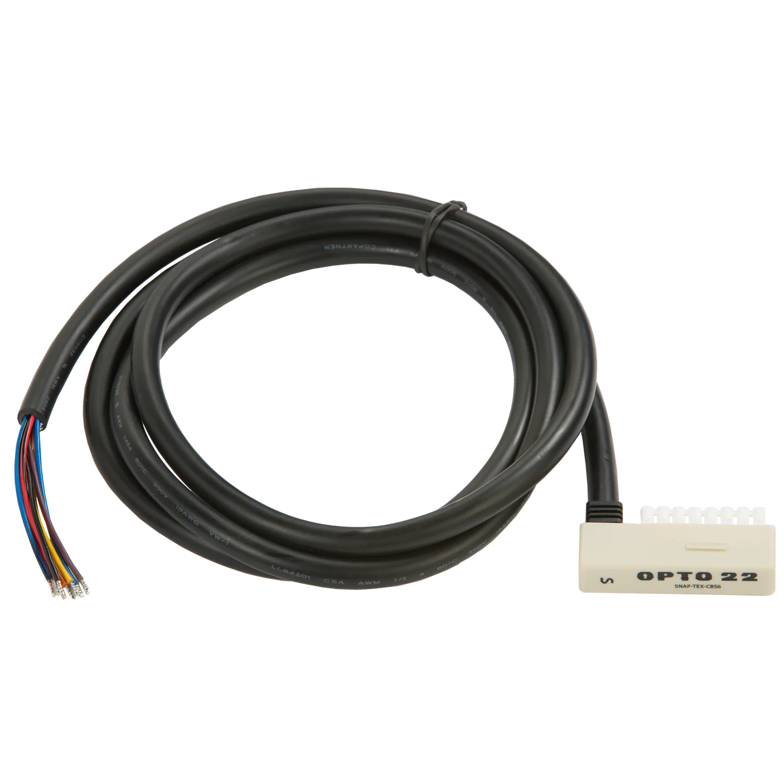 Part of the SNAP TEX family of mounting and wiring accessories, the SNAP-TEX-CBS6 cable provides neat, protected wiring from the top of a SNAP I/O module to a SNAP TEX breakout board. The cable is six feet (1.8 m) long.