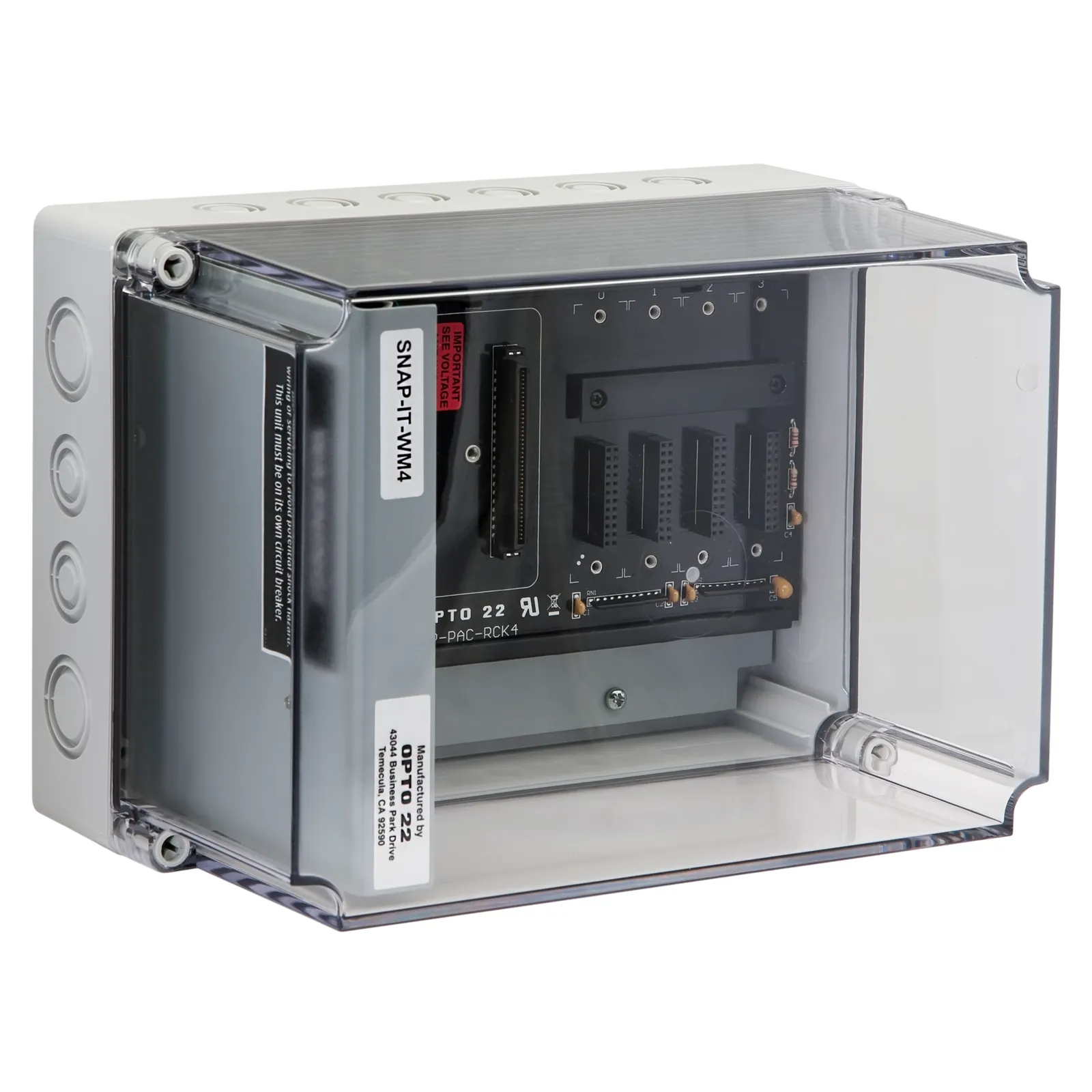 The SNAP-IT-WM4 wall-mounted polycarbonate enclosure makes it easy to install Opto 22 I/O where you need it, providing convenience and protection for your SNAP PAC System.