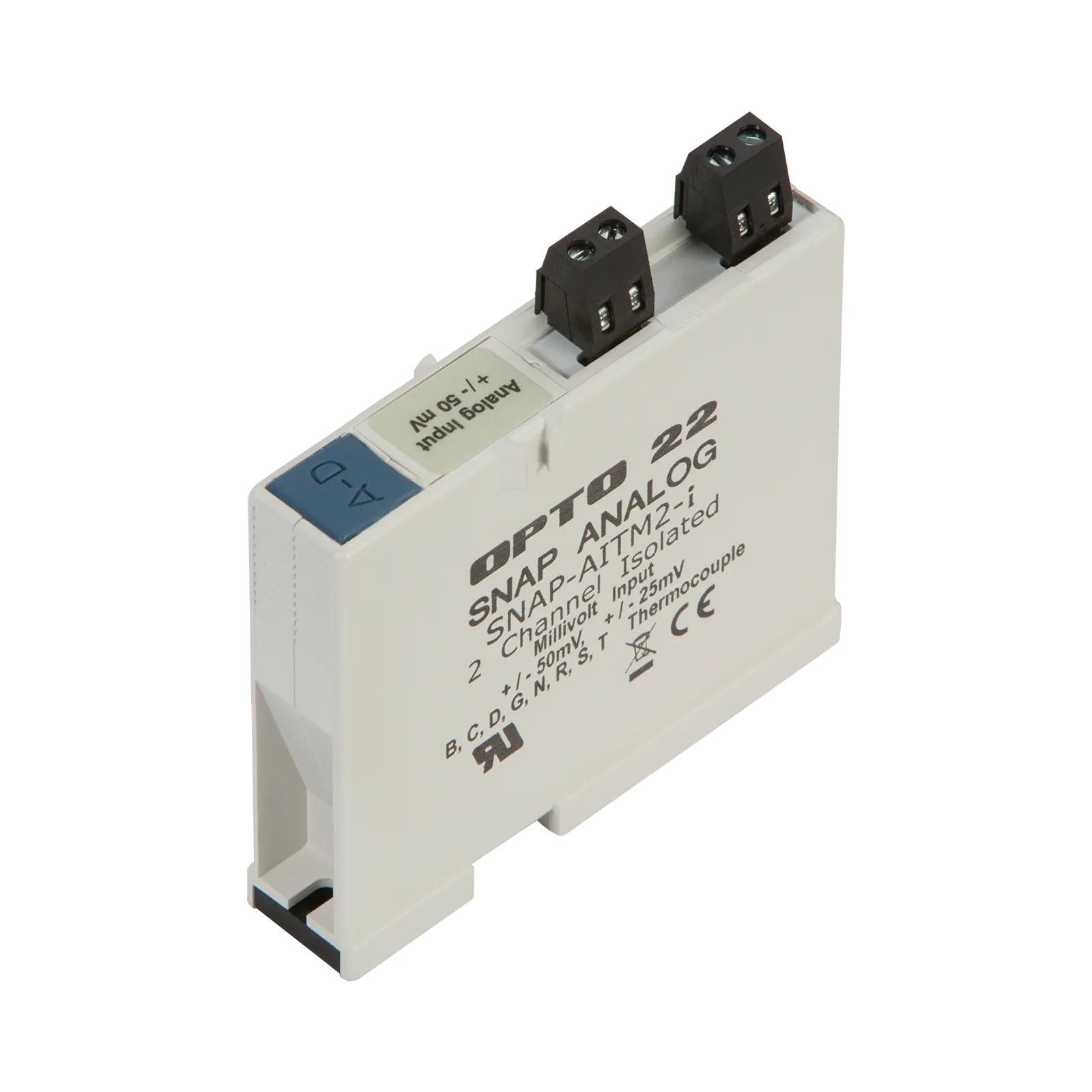 The SNAP-AITM2-i provides two isolated channels, each with an input range of -50 to +50 mV, -25 to +25 mV, or type B,C,D,G,N,T,R, or S thermocouple. In addition to having two channels isolated from each other, the module is also transformer isolated and optically isolated from other modules and devices.