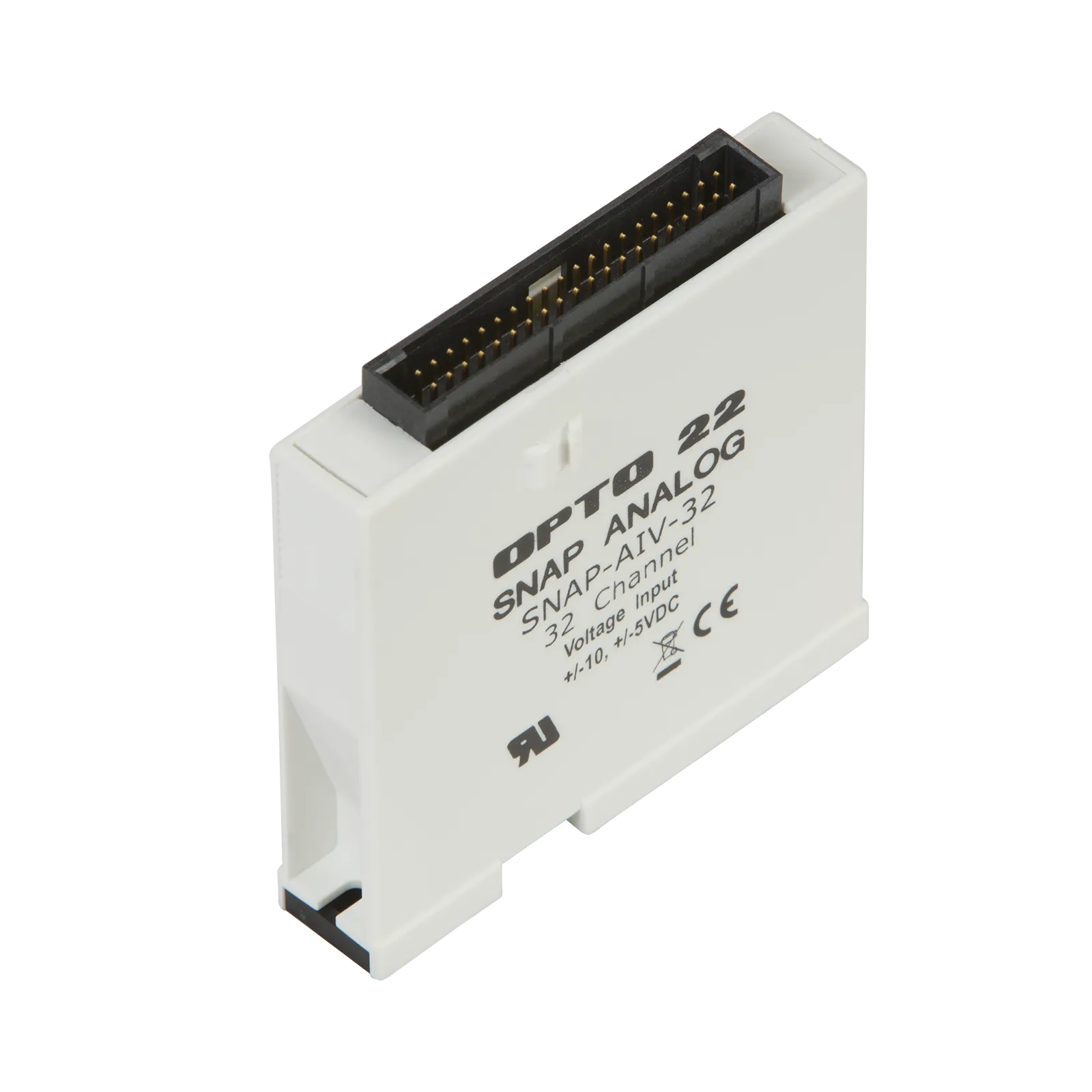 The SNAP-AIV-32 analog input module provides 32 channels of analog voltage input. Each channel can be configured for -10 to +10 VDC or -5 to +5 VDC operation. Although the 32 channels are not isolated from each other, the module is transformer isolated and optically isolated from other modules and devices.