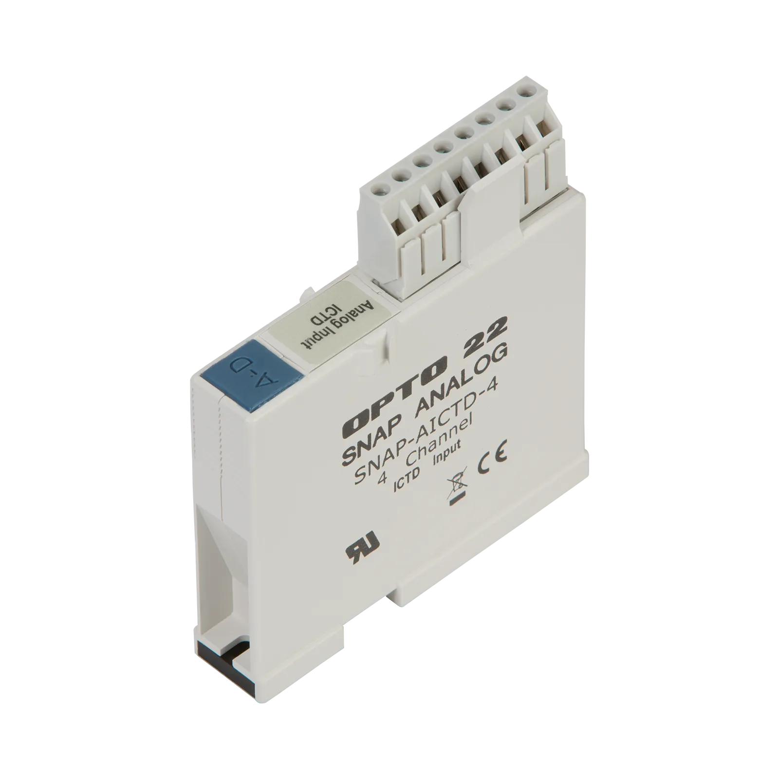 The SNAP-AICTD provides four channels of analog temperature input from any industry-standard Integrated Circuit Temperature Device (ICTD). Simple two-wire connections are made to the pluggable terminal strip on top of the module. Although the four channels are not isolated from each other, the module is transformer isolated and optically isolated from other modules and devices.