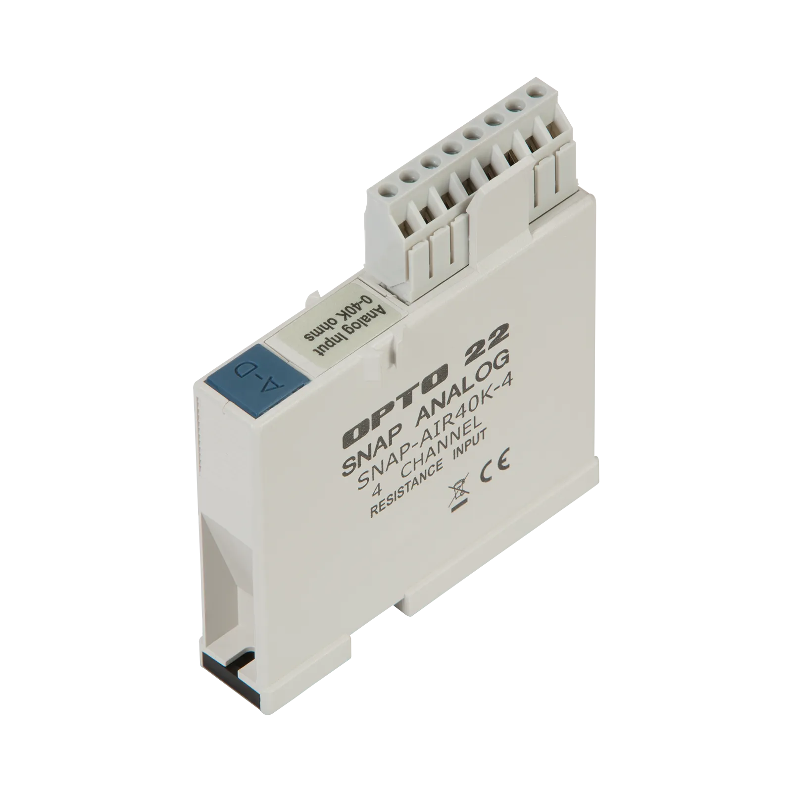 The SNAP-AIR40K-4 provides four channels of analog-to-digital conversion, ideal for thermistors used in HVAC applications or for reading the resistance of potentiometer input. Default range is 0-40 K Ohms; the module can also be configured for 0-20 K, 0-10 K, or 0-5 K Ohms. Resistance probes must be isolated from each other.