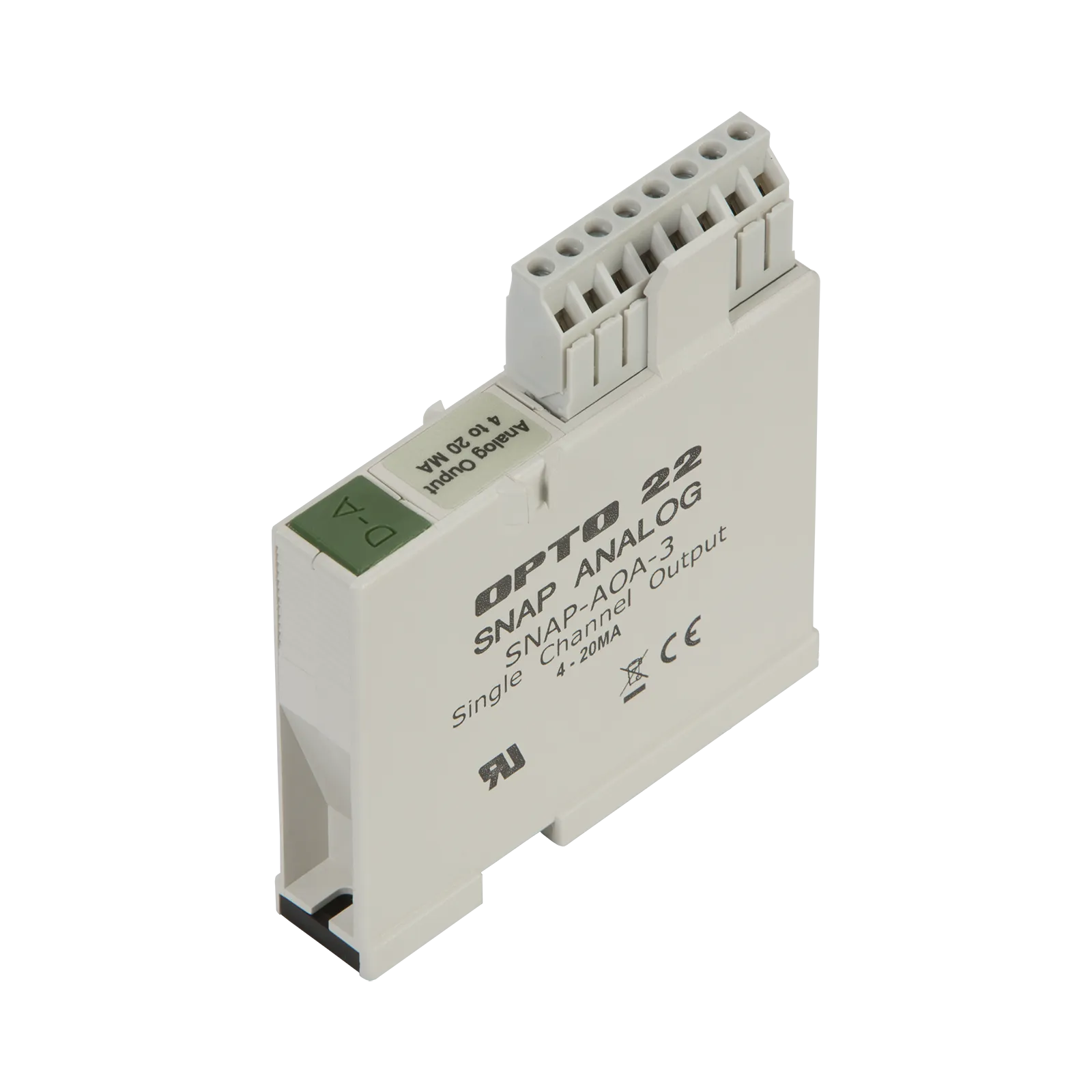 The SNAP-AOA-3 provides a single channel of digital-to-analog conversion. The module has a true differential (floating) output that eliminates ground loops and has a nominal output range of 4-20 mA. The module is transformer isolated and optically isolated from other modules and devices, and is factory calibrated.