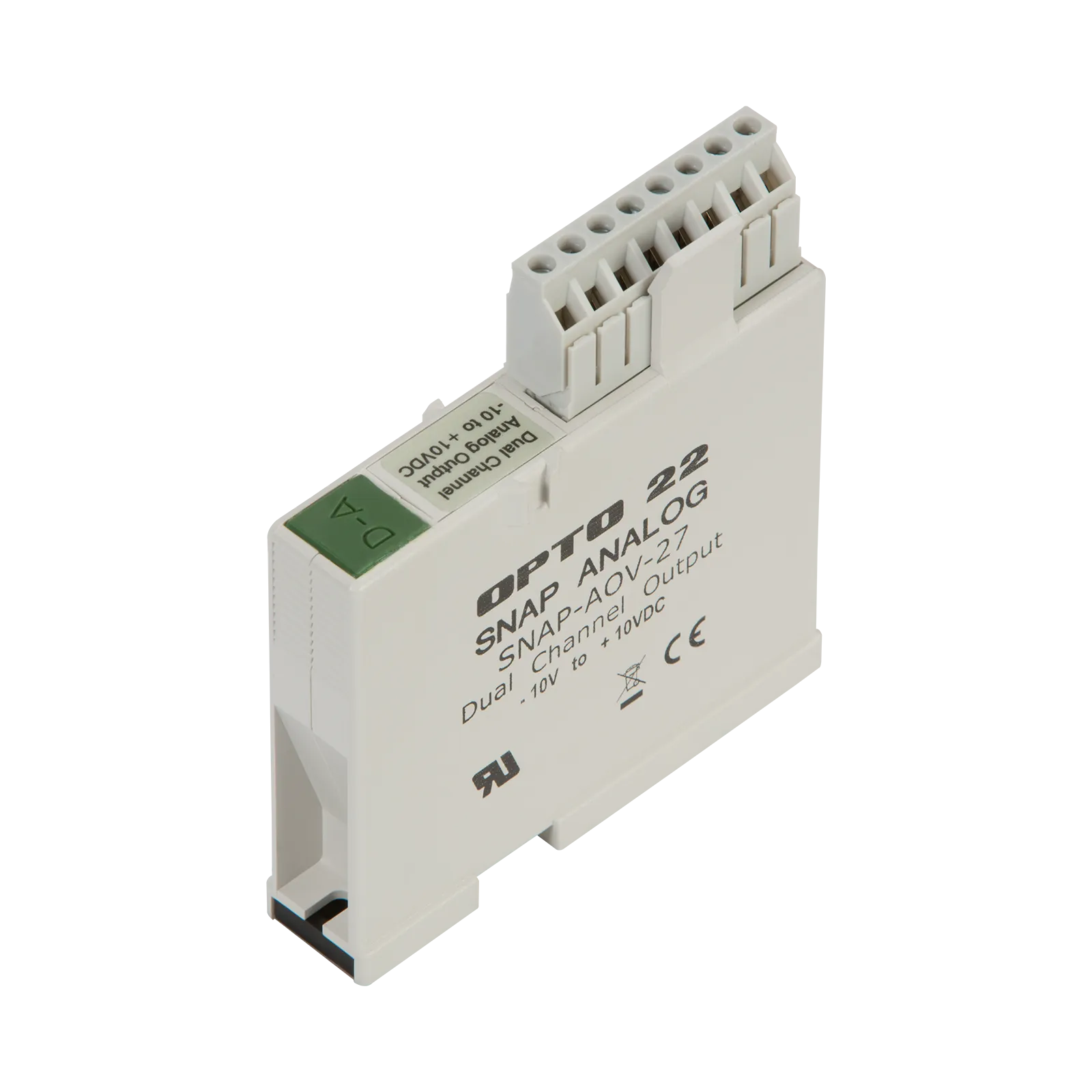 The SNAP-AOV-27 provides two channels of analog voltage output at a nominal range of -10 to +10 volts. Each channel can supply -5 or +5 mA of load current. Although the two channels are not isolated from each other, the module is transformer isolated and optically isolated from other modules and devices. The module is factory calibrated.