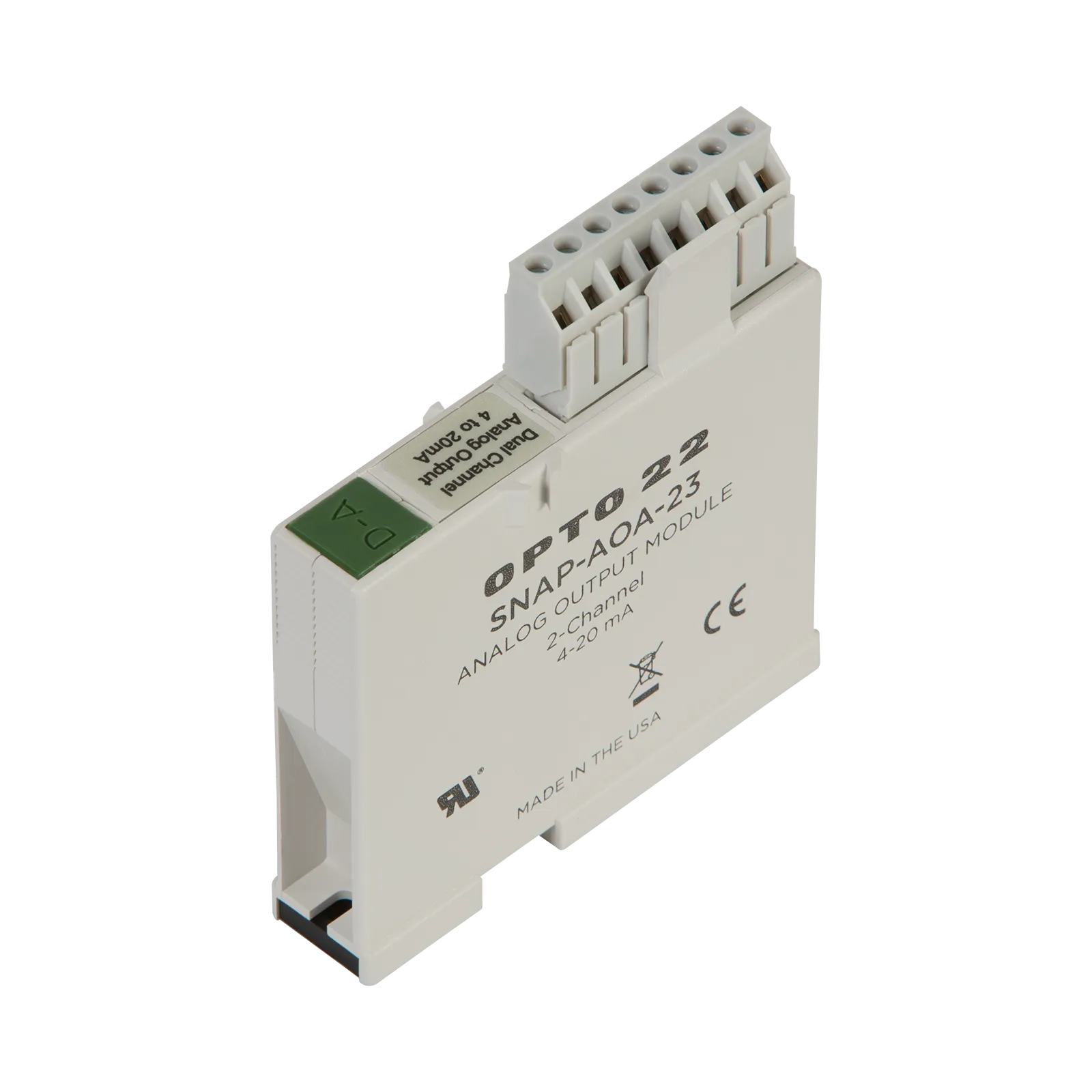 The SNAP-AOA-23 provides two channels of analog current output at a nominal range of 4-20 mA. An external loop power source is required for the current loops. Although the two channels are not isolated from each other, the module is transformer isolated and optically isolated from other modules and devices. The module is factory calibrated.
