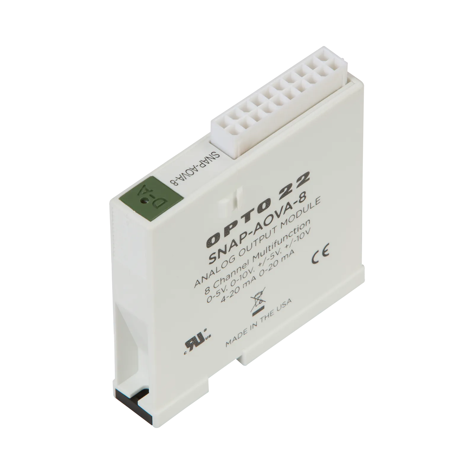 The SNAP-AOVA-8 analog output module has 8 channels, each individually configurable for any one of six voltage or current output ranges.