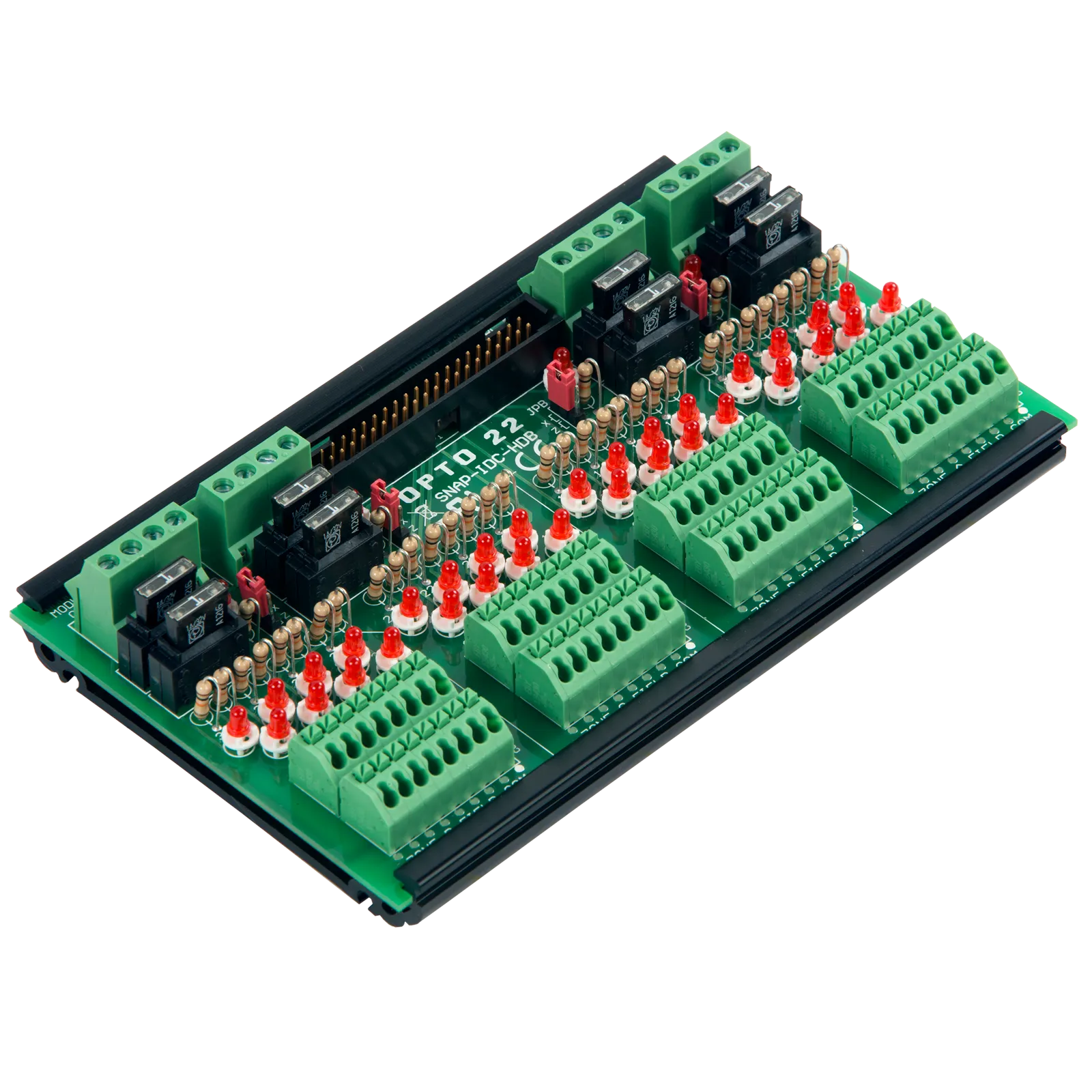 The SNAP-IDC-HDB breakout rack is used with one 32-channel digital input module, such as the SNAP-IDC-32. The breakout rack provides LED indicators and easily accessible fused connectors for input points.