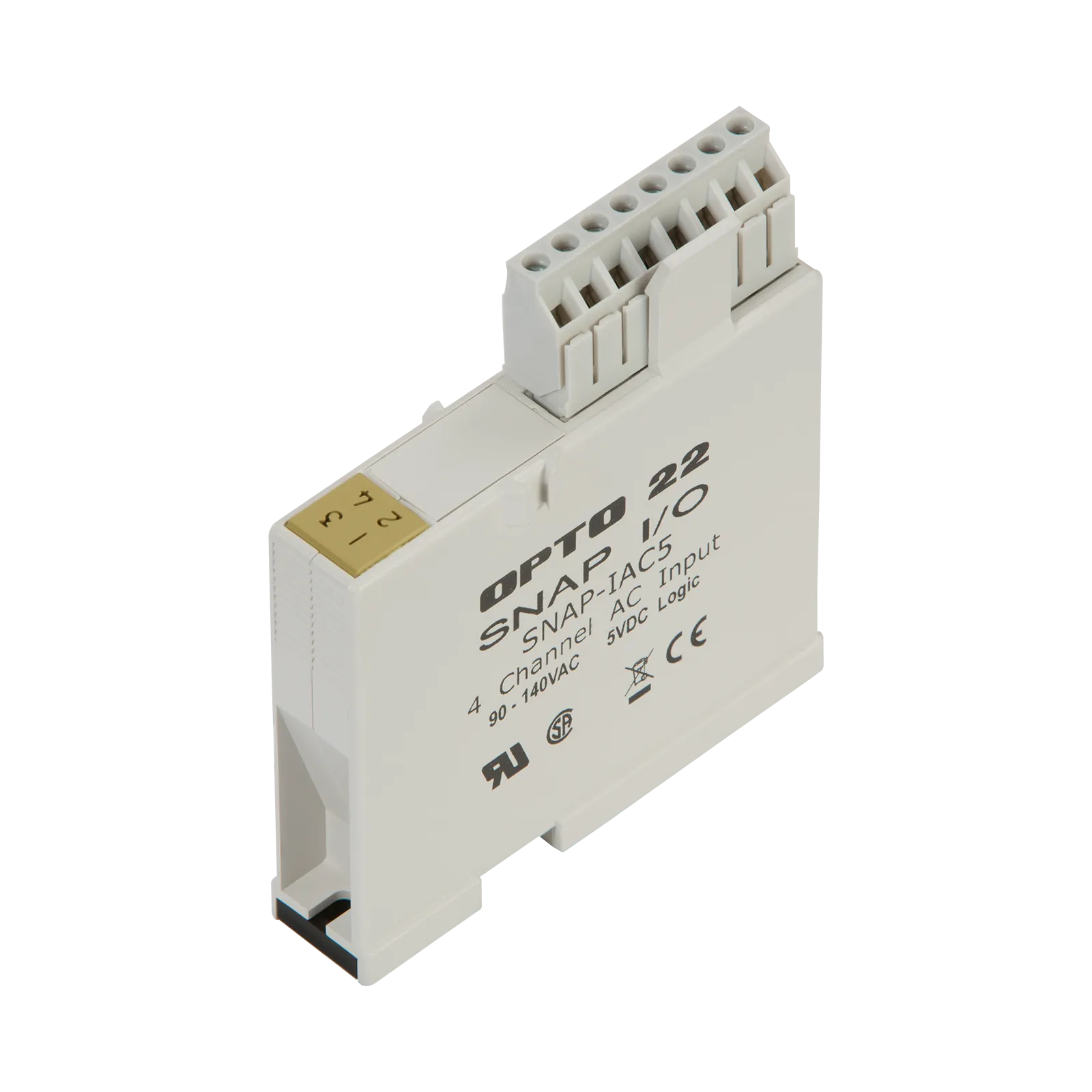 The SNAP-IAC5 provides four channels of 90-140 VAC/VDC digital input. Each channel senses the on/off status for AC (or DC) voltages from sources such as proximity switches, push buttons, or auxiliary contacts. The module has removable top-mounted connectors for easy access to field wiring, as well as channel-specific LEDs for convenient troubleshooting.