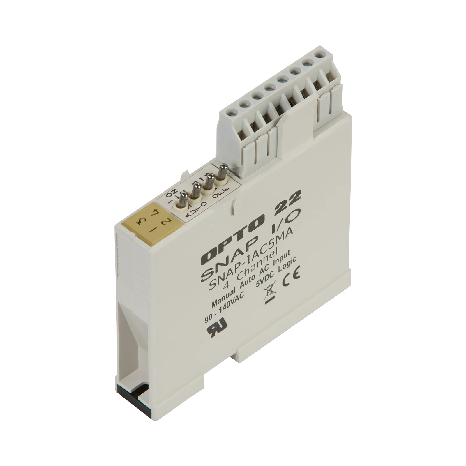 The SNAP-IAC5MA provides four channels of 90-140 VAC/VDC digital input. Each channel senses the on/off status for AC (or DC) voltages from sources such as proximity switches, push buttons, or auxiliary contacts. This module features manual-on/manual-off/automatic switches that override input from field devices and are ideal for testing control applications.