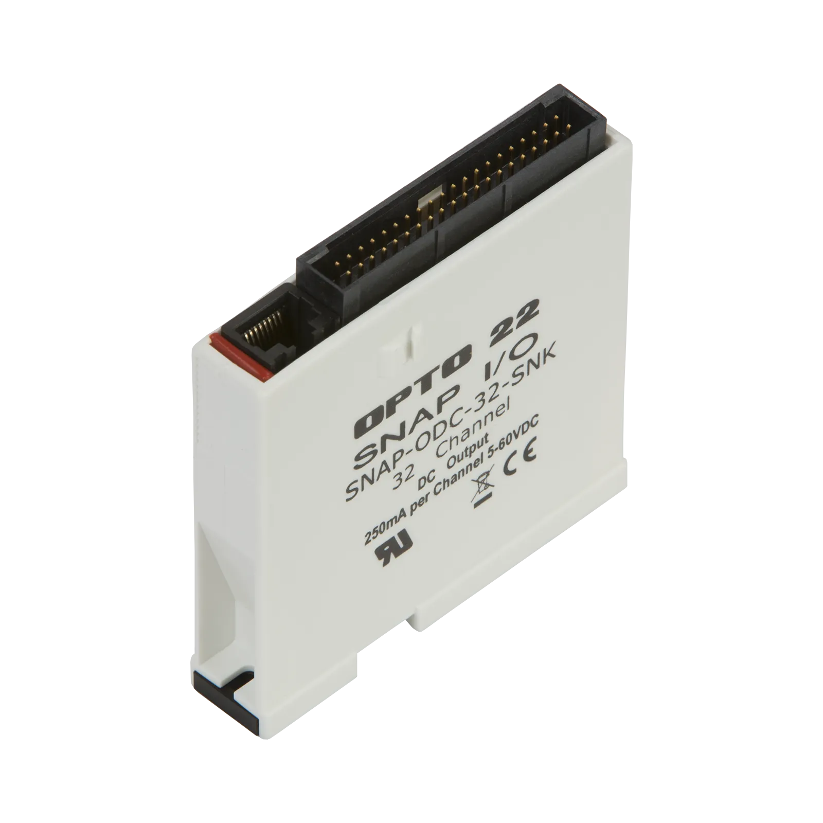 The SNAP-ODC-32-SNK digital output module (load sinking) provides 32 digital output channels in one compact SNAP module. This module is ideal for OEMs and others with applications with high point counts, or for those requiring a large number of digital output channels on one SNAP I/O rack. The high-density configuration reduces per-point costs of digital I/O systems by providing up to eight times as many I/O channels in the same space.