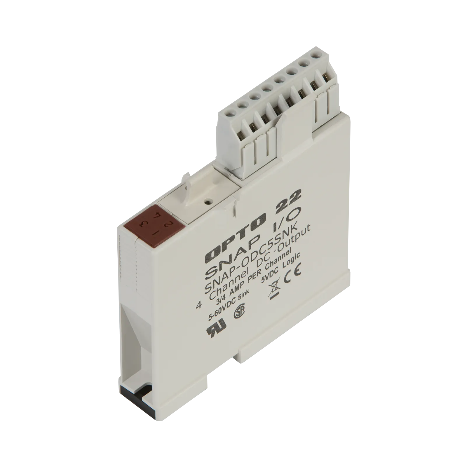 The SNAP-ODC5SNK provides four channels of 5-60 VDC digital output in a sink configuration, each channel switching a separate DC load. The module features a removable top-mounted connector for easy access to field wiring and channel-specific LEDs for troubleshooting.