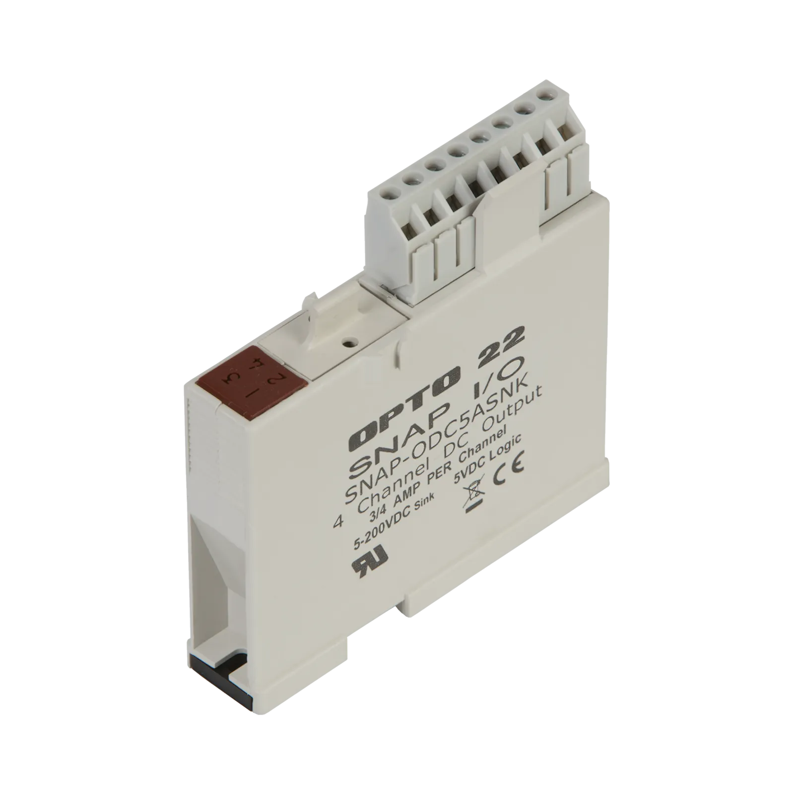 The SNAP-ODC5ASNK provides four channels of 5-200 VDC digital output in a sink configuration, each channel switching a separate DC load. The module features a removable top-mounted connector for easy access to field wiring and channel-specific LEDs for troubleshooting.
