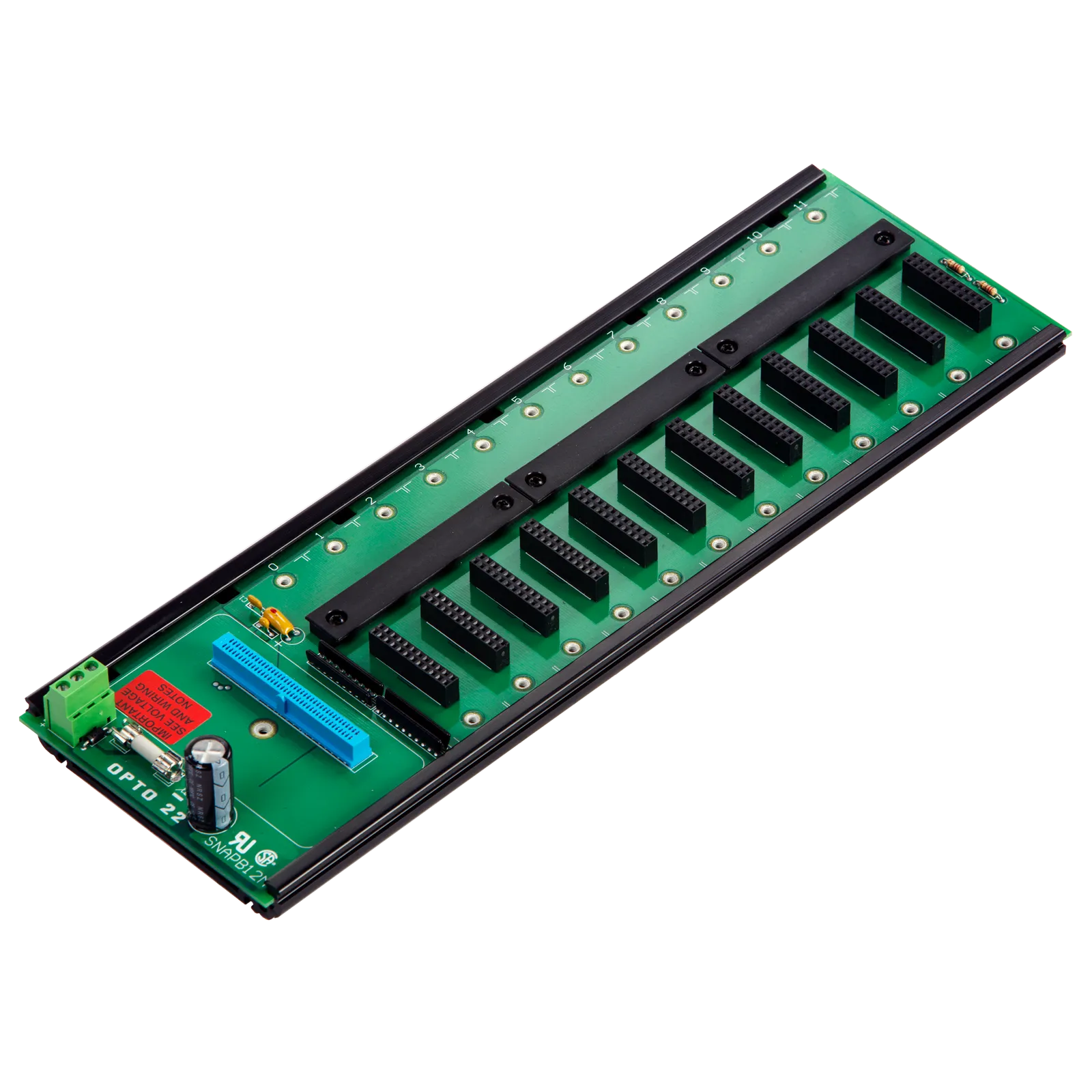 The SNAP-B12M rack mounts a compatible SNAP brain (such as the serial B3000 or the SNAP-UP1-ADS) and 12 SNAP I/O modules. Analog, digital, and serial modules can be mixed on the same rack. Four-channel digital modules can be placed in the first eight positions only; 32-channel digital modules can be placed in any position. Field devices are wired directly to the top-mounted removable connectors on the SNAP I/O modules. The rack can be panel mounted or DIN-rail mounted. It requires a 5 VDC power source.