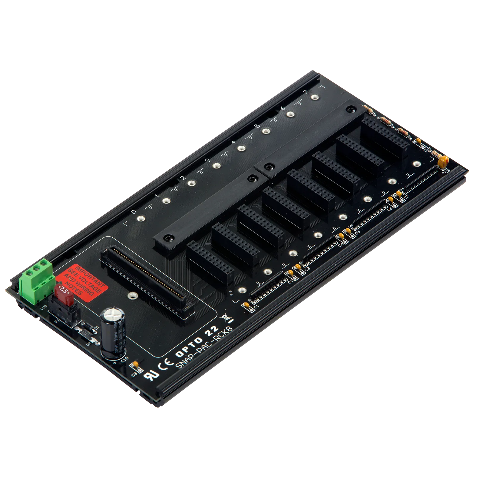 The SNAP-PAC-RCK8 mounts one SNAP PAC brain or on-the-rack controller and up to 8 analog, digital, serial, and special-purpose SNAP I/O modules. The SNAP-PAC-RCK8 can be DIN-rail or panel mounted.
