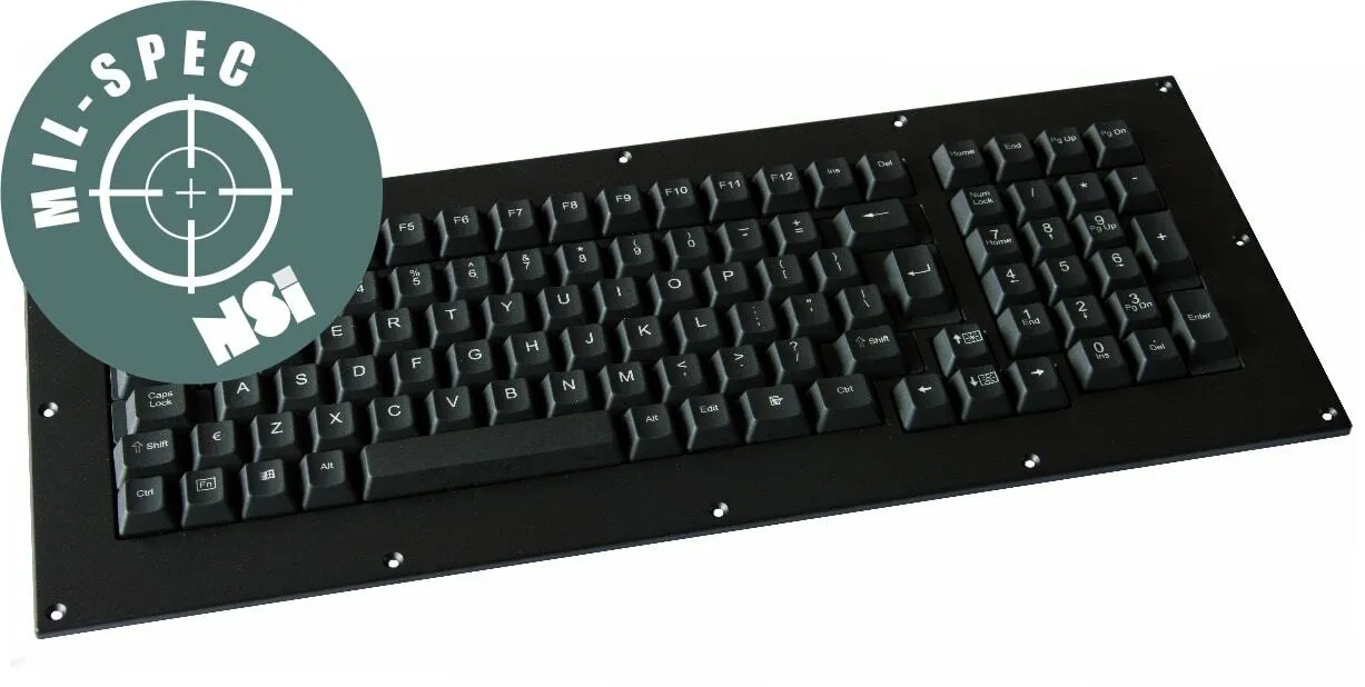 Keyboard milspec, desktop, IP65 closed, 104 full travel keys, US English Qwerty, USB interface, Mil810G, 461G en DO-160 certified