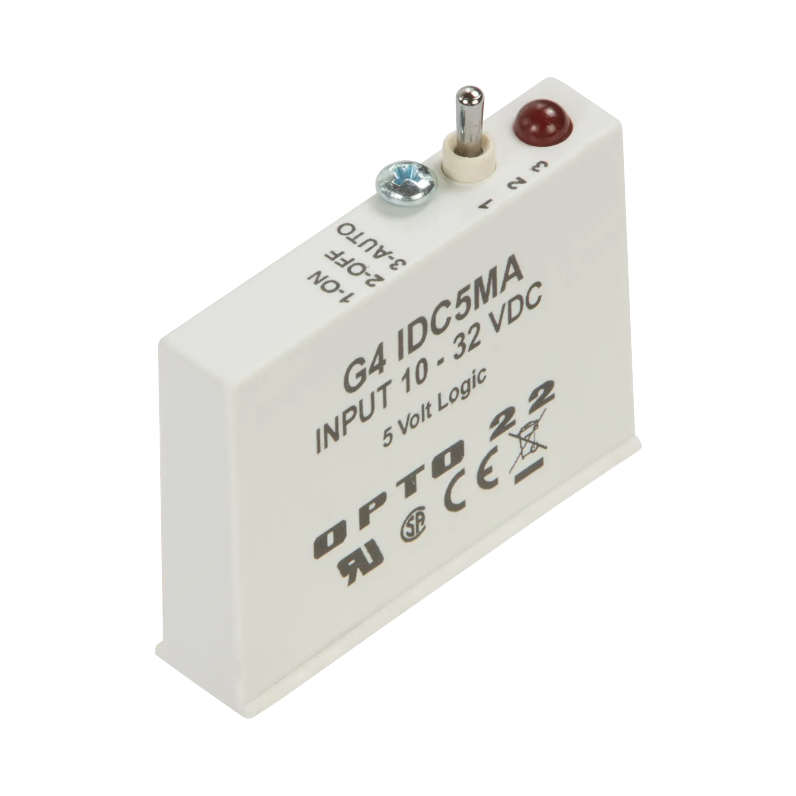 The G4IDC5MA is a digital DC input module with an input voltage range of 10-32 VDC (or 12-32 VAC), requiring a typical logic voltage of 5 VDC. This module is compatible with Opto 22 brains and with a Raspberry Pi. The G4IDC5MA features a manual-on/manual-off/automatic switch, ideal for diagnostic testing of control applications. This module is designed with filtering on the input and a hysteresis amplifier, providing high noise rejection and transient-free, “clean” switching. Opto 22’s G4 DC input modules are used to detect on/off DC voltage levels. Each module provides up to 4000 volts (transient) of optical isolation between field inputs and the logic output of the circuit. Typical applications for DC input modules include sensing the presence or absence of voltage and sensing contact closure from sources such as proximity switches, limit switches, selector switches, push buttons, photoelectric switches, and TTL-compatible devices.