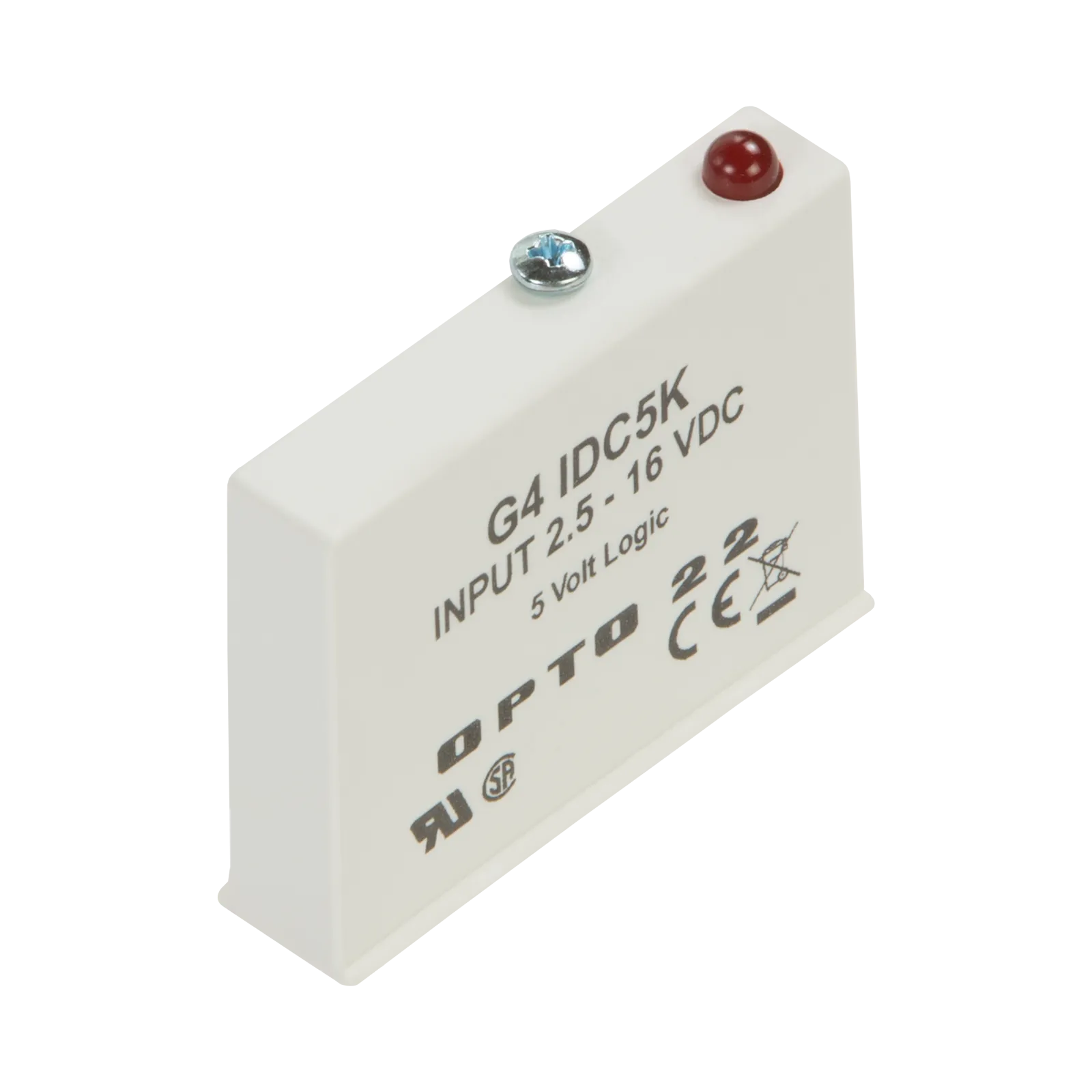 The G4IDC5K is a fast-switching module used to detect signals produced by photoelectric switches and TTL devices. This digital DC input module has an input voltage range of 2.5 to 16 VDC, requiring a typical logic voltage of 5 VDC. This module is compatible with Opto 22 brains. Opto 22’s G4 DC input modules are used to detect on/off DC voltage levels. Each module provides up to 4000 volts (transient) of optical isolation between field inputs and the logic output of the circuit.