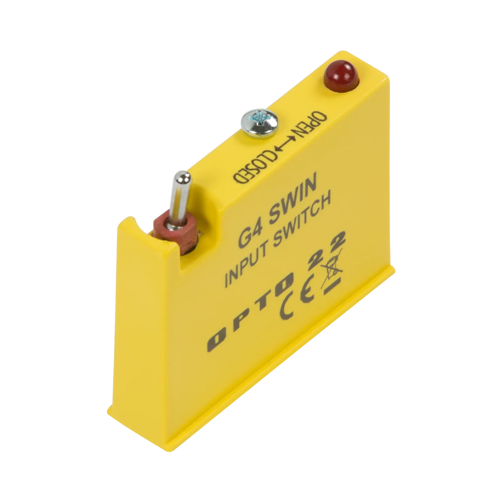 The G4SWIN input test module is used to simulate an input on an I/O mounting rack. Each module contains a toggle switch that closes a contact on the logic side of the module. An internal resistor limits the current through the switch and provides a load similar to that of an actual input module. An internal debounce circuit allows rapid switch closures without false counts. The G4SWIN module works with logic voltages of 5, 15, and 24 volts. Internally, there is no connection to the field inputs. The G4SWIN module is ideal for simulating discrete external events when testing application software.