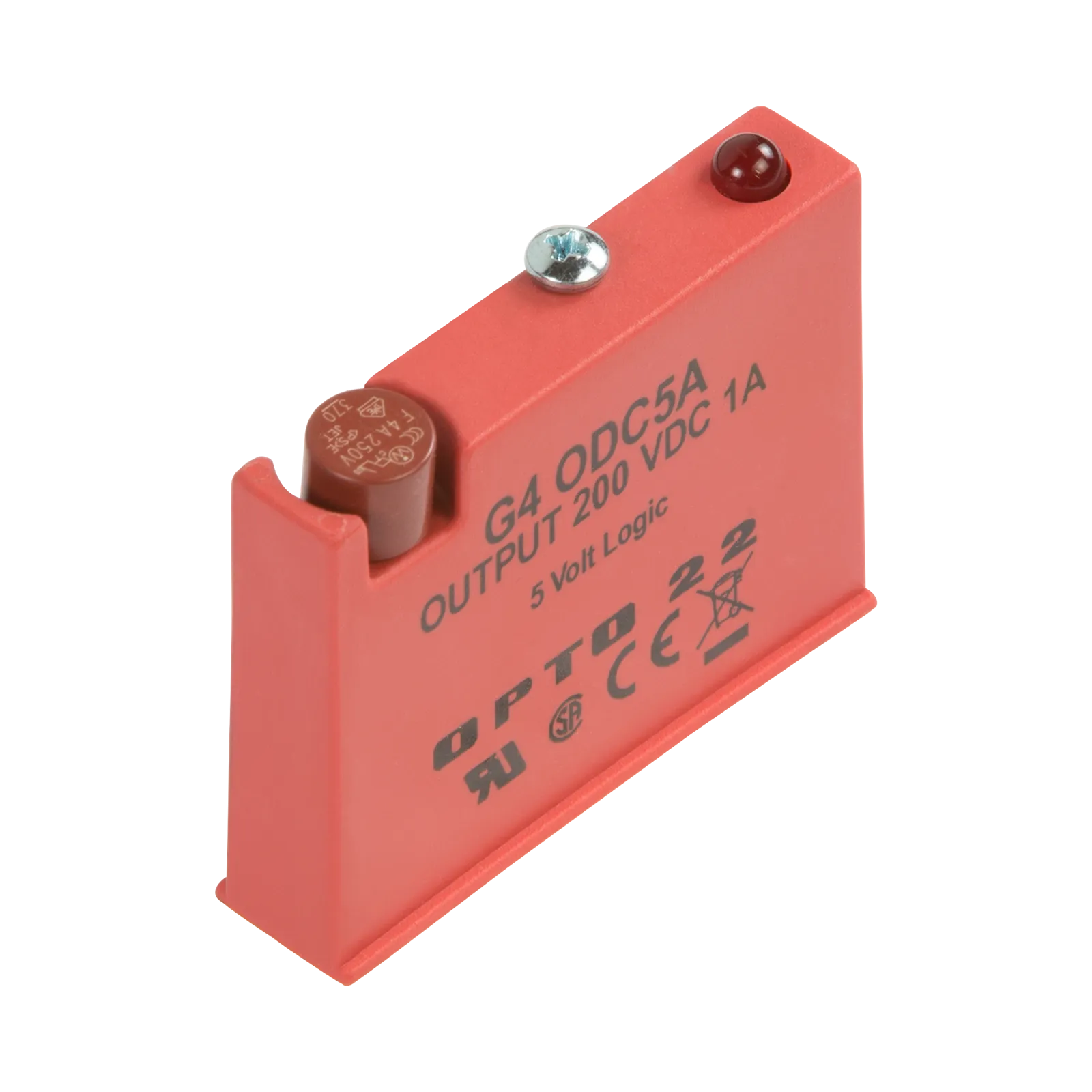 The G4ODC5A is a digital DC output module with an output voltage range of 5-200 VDC, requiring a typical logic voltage of 5 VDC. It is compatible with Opto 22 brains and with a Raspberry Pi. The module includes a built-in LED status indicator and a removable fuse. G4 DC output modules are used to control or switch DC loads. Each module provides up to 4000 volts of optical isolation (transient) between field devices and control logic. Typical applications for DC output modules include switching loads such as DC relays, solenoids, motor starters, lamps, and indicators.