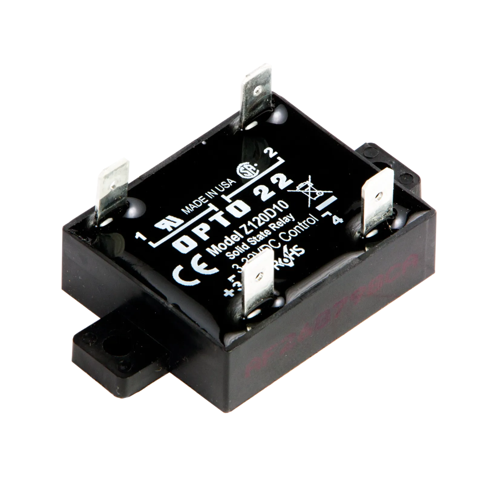 The Z120D10 is a DC-controlled relay that switches 120 VAC at up to 10 A.