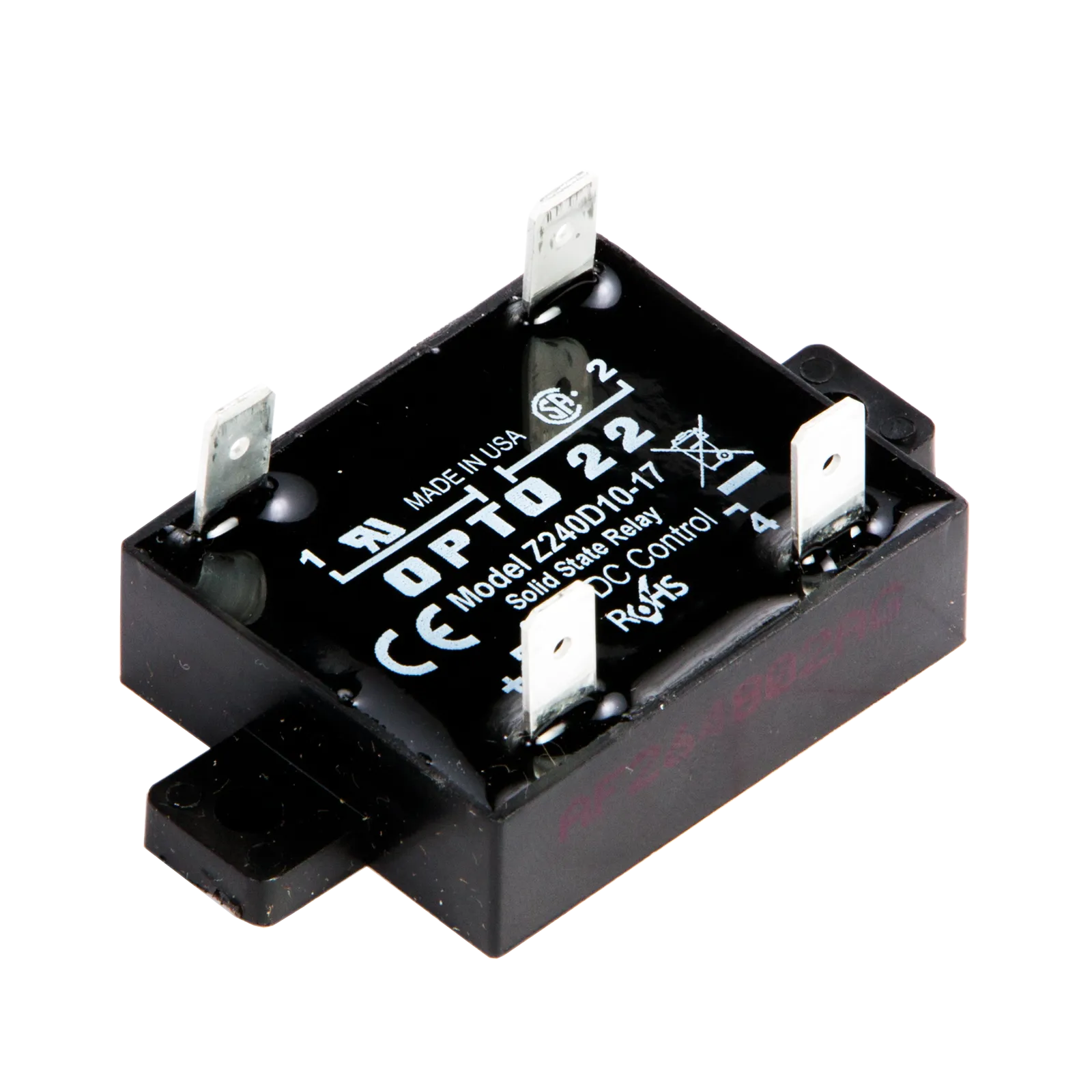 This Z Model, 240 VAC, 10 Amp, DC Control Solid State Relay (SSR) should be used as a replacement part only. For new development, use the equivalent Z240D10 SSR instead. The two parts are manufactured identically using the same VDE-approved optocoupler and have identical specifications.