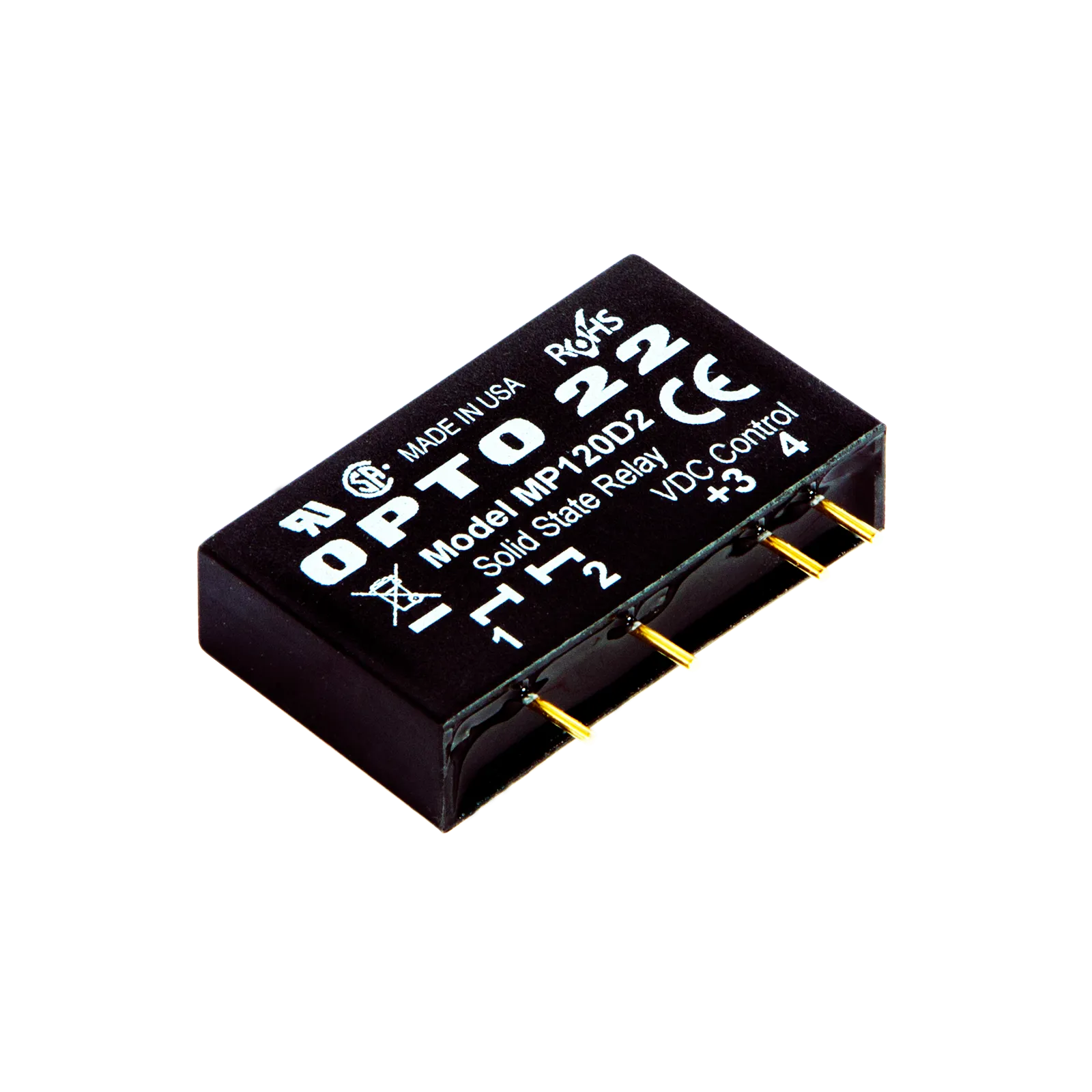 The MP120D2 is a DC-controlled MP Series relay that switches 120 VAC at up to 2 A.