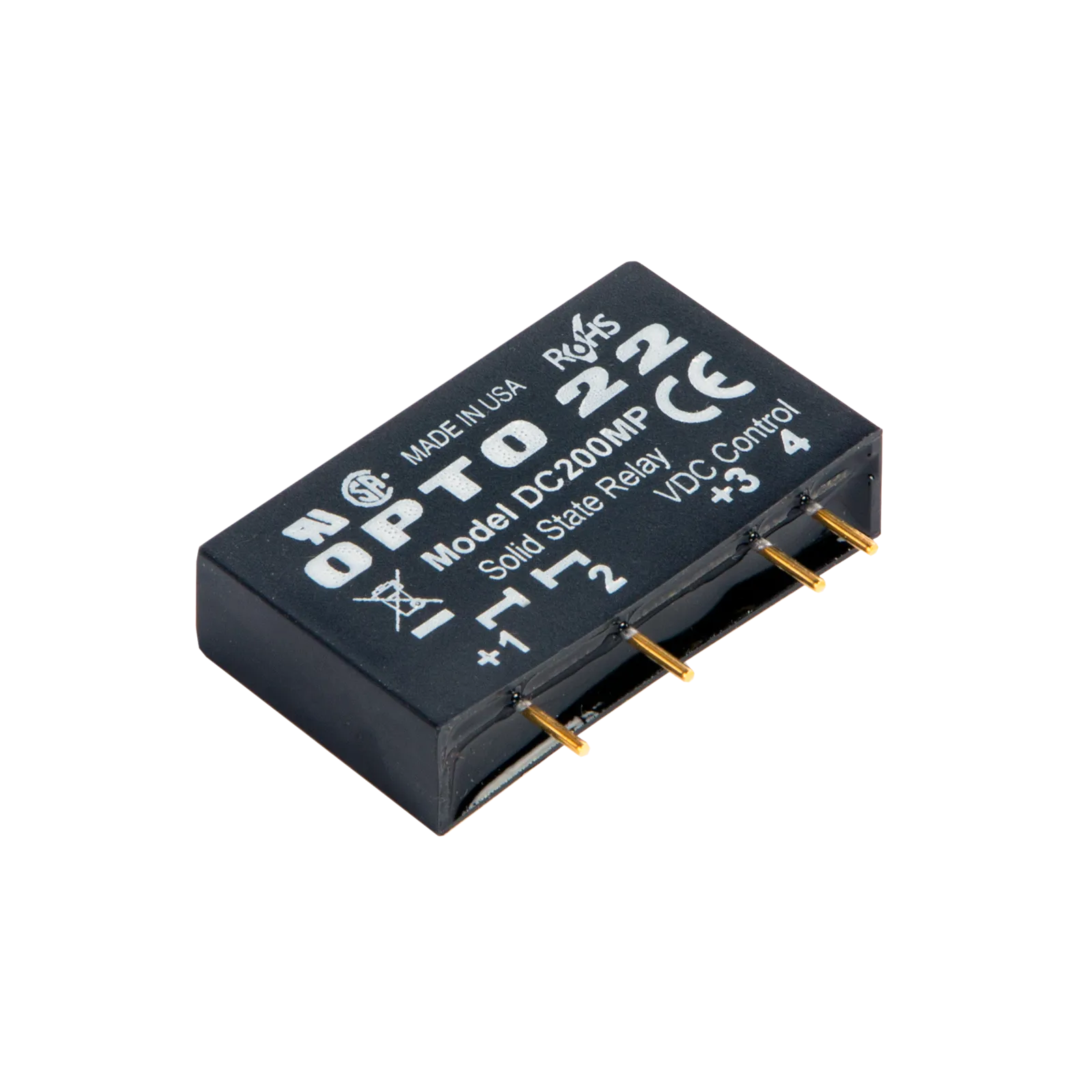 The DC200MP is a DC-controlled MP Series relay that switches 200 VDC at up to 1 A.