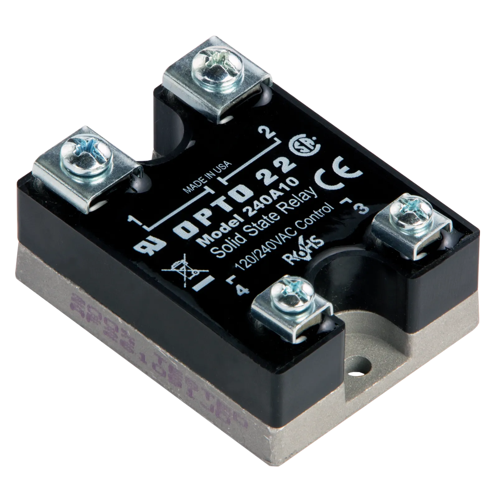 The 240A10 is an AC-controlled Power Series relay that switches 240 VAC at up to 10 A.