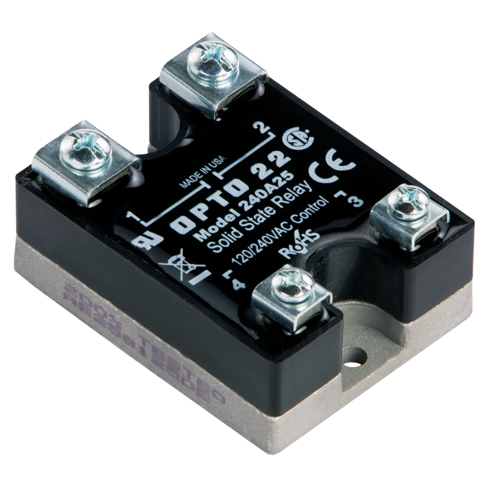 The 240A25 is an AC-controlled Power Series relay that switches 240 VAC at up to 25 A.