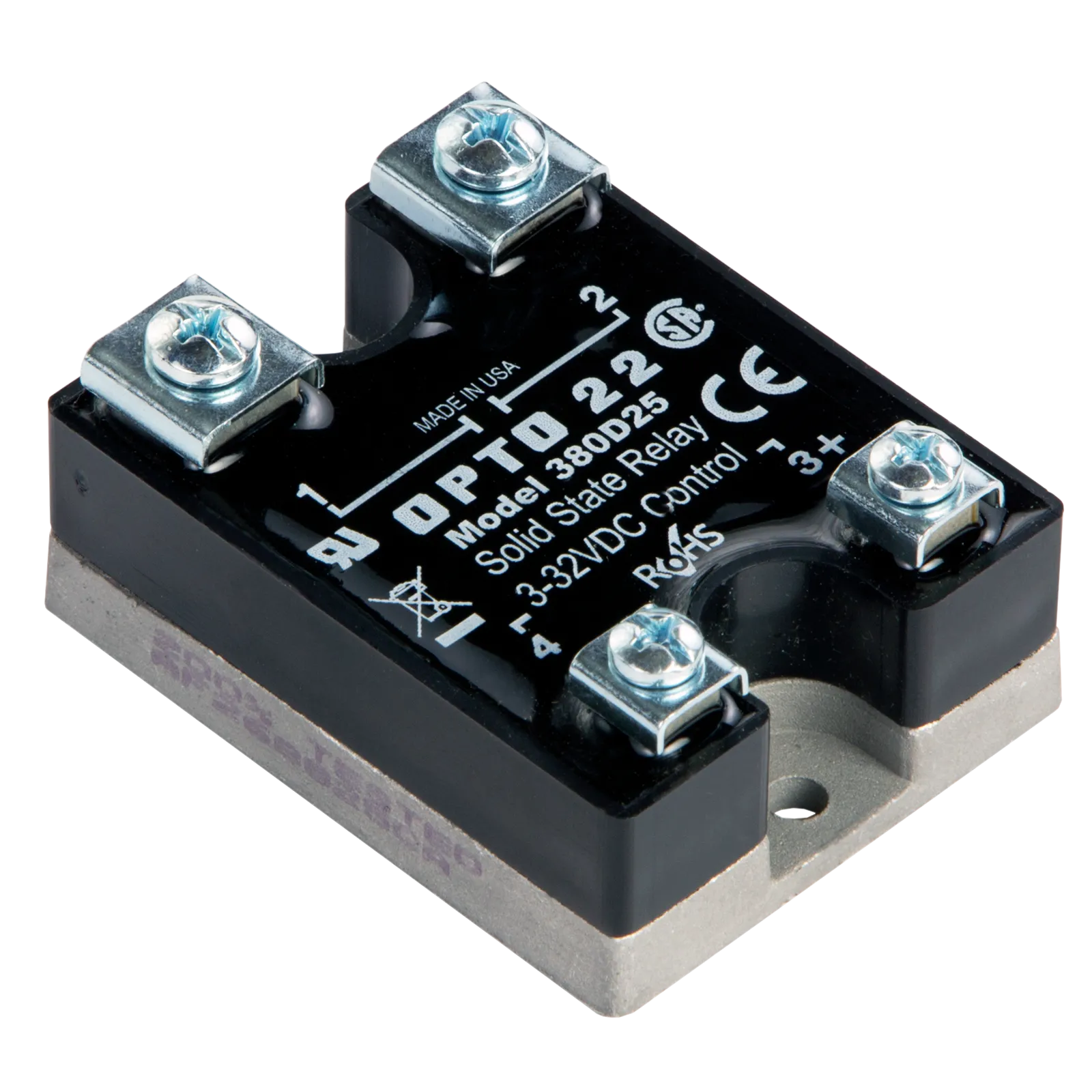 The 380D25 is a DC-controlled Power Series relay that switches 380 VAC at up to 25 A.